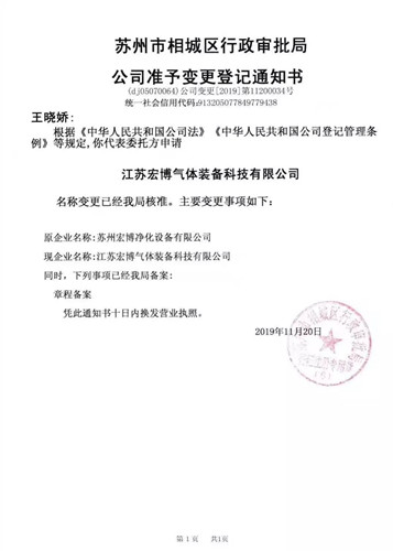 為適應市場經營和公司發(fā)展需要,2019年11月20日,經蘇州市相城區(qū)行政審批局核準,原“蘇州宏博凈化設備有限公司”正式變更登記為“江蘇宏博氣體裝備科技有限公司”。